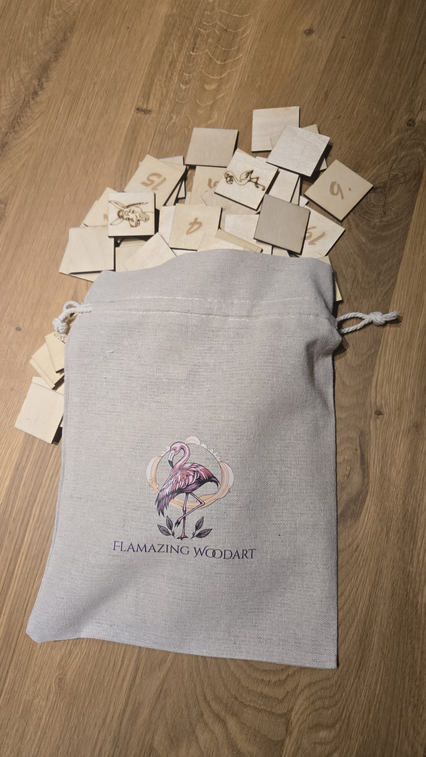 Das Spiel kommt in einem robusten Leinenbeutel mit Kordelzug und dem farbigen „Flamazing Woodart“-Logo. Damit ist das Spiel im Handumdrehen aufgeräumt und geht nie verloren. Dank des kompakten Formats eignet es sich hervorragend als Reisespiel für den Urlaub, für den Besuch im Biergarten oder als Mitbringsel zum Spieleabend.