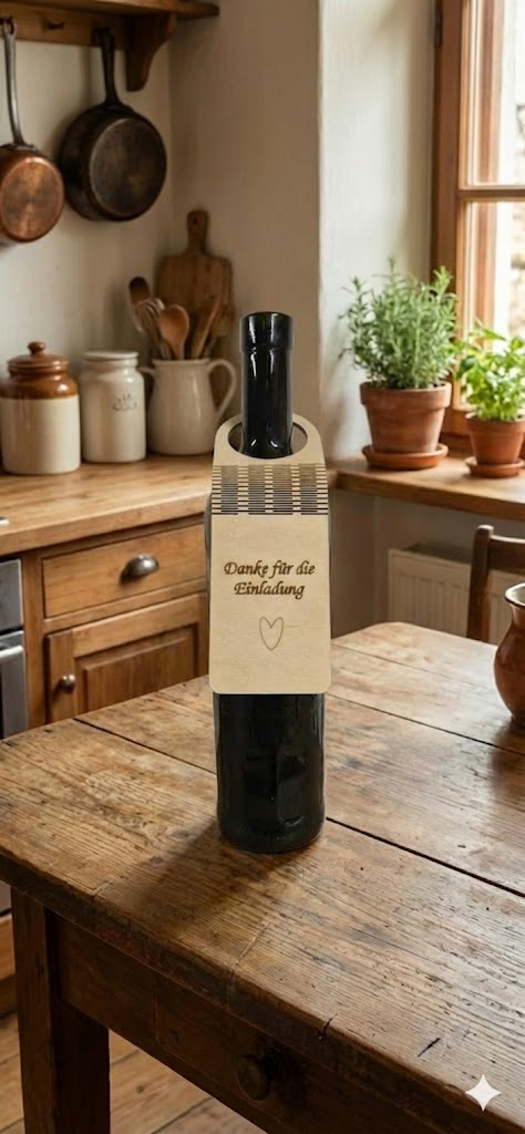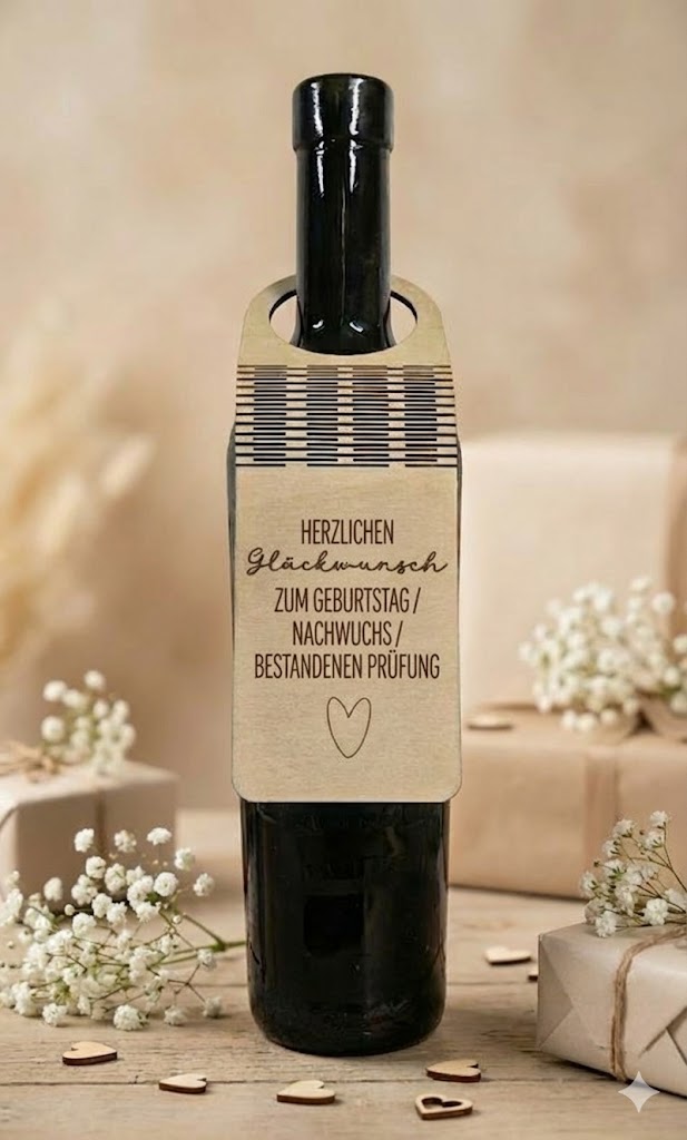 🎄 Edle Holzanhänger fĂĽr Flaschen – mit Gravur „Herzlichen GlĂĽckwunsch“ oder „Danke fĂĽr die Einladung“.